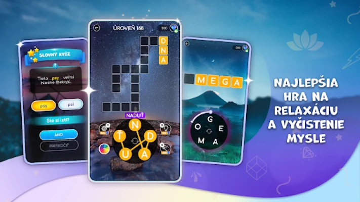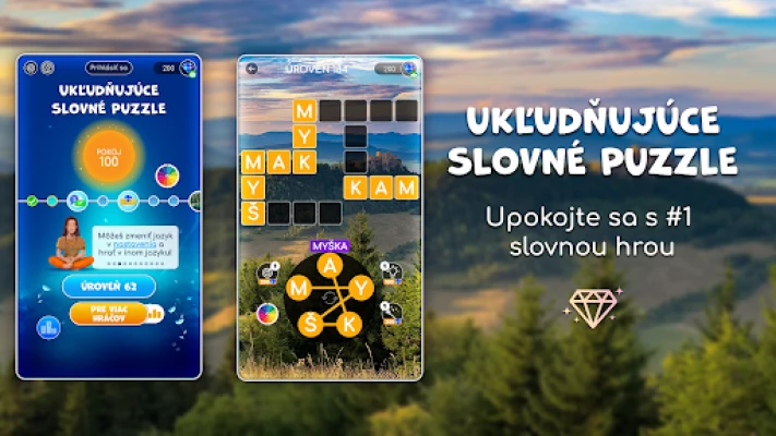Nielenže si oddýchnete, ale zároveň si rozšírite obzory! Zlepšite si slovnú zásobu a prehĺbte si geografické znalosti, zatiaľ čo si užívate upokojujúce scenérie s animáciami a pôsobivými zvukovými efektmi. Táto hra je prístupná a zábavná pre každého, od detí po dospelých, a je plne optimalizovaná pre mobilné telefóny aj tablety, čo Vám umožní hrať kdekoľvek a kedykoľvek. Aby bol Váš zážitok plynulý, každý deň na Vás čaká darček vo forme drahokamov, ktoré Vám pomôžu prejsť aj tými najzložitejšími hádankami, ak sa niekedy zaseknete. Veľmi si ceníme Váš názor a neustále sa snažíme vylepšovať, takže sa neváhajte podeliť o svoje nápady. Ukľudňujúce slovné puzzle si môžete vychutnať v desiatkach jazykov, vrátane slovenčiny, češtiny, angličtiny, nemčiny, francúzštiny, španielčiny, taliančiny, portugalčiny, ruštiny, poľštiny a mnohých ďalších, čo zaručuje globálny dosah a personalizovaný zážitok.